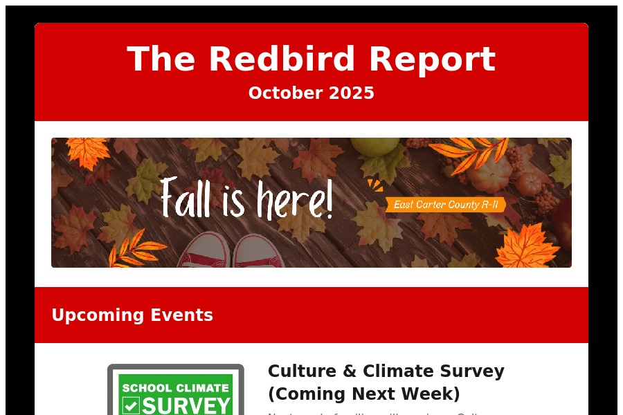 The Redbird Report October 2025 Upcoming Events Culture & Climate Survey (Coming Next Week) Next week, families will receive. . .