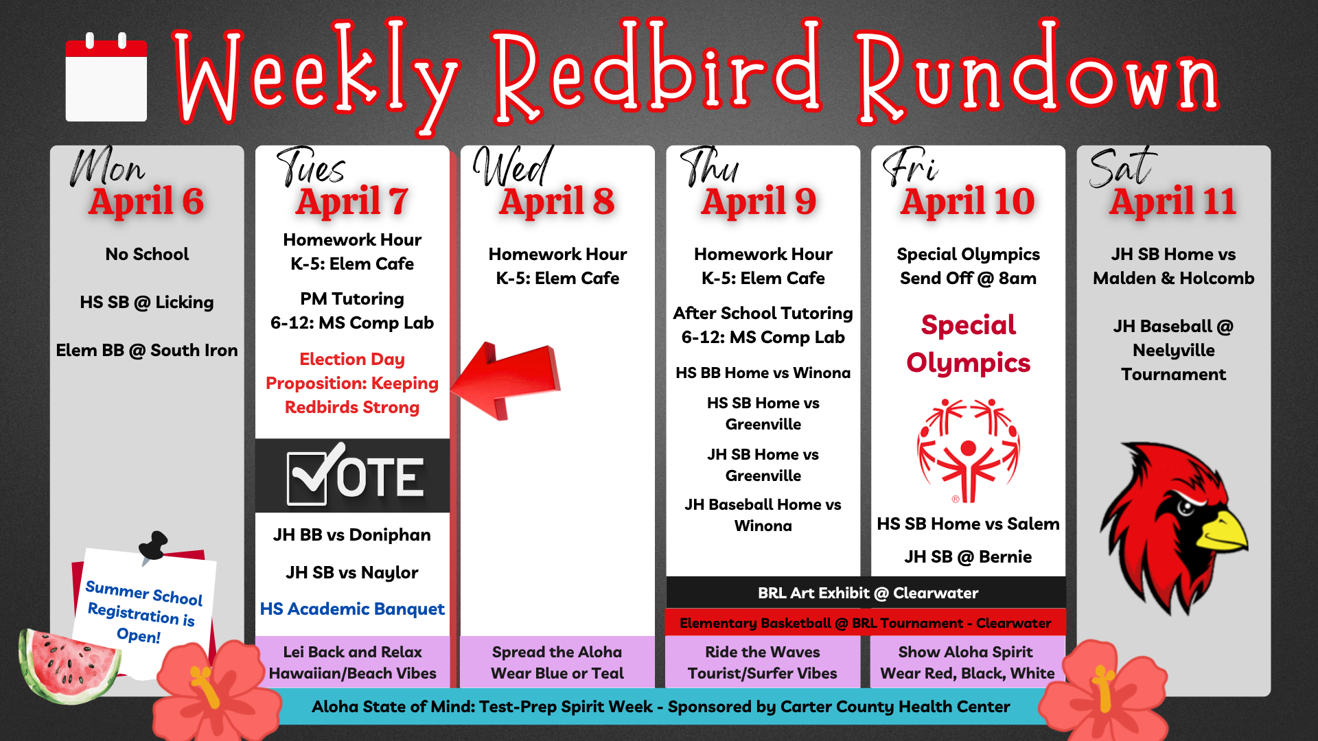 🌺 Aloha State of Mind. 🌺 State Testing Spirit Week and Incentives ❤️🖤 We are so grateful for our partnership with Carter County Health Center! 🖤❤️ Because of their generosity in utilizing a grant f...